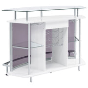 Chic with striking mixed material design, this contemporary bar unit elevates a modern style home. With a curved shape, this bar unit works perfectly in the corner of a media room or dining space, offering a place for guests to conjure together and serve themselves. A beautiful finish offers a classy touch and glam vibe, while a clear tempered glass top floats above, offering ample space to store barware and tumblers. Two smoked acrylic front panels showcase hanging stemware racks and libations, displaying what you have available. In addition, guests can slide up a stool or stand comfortably, resting along a steel footrest. Key Features: • Contemporary crescent shaped front bar unit in white high gloss lacquer finish • Clear tempered glass top and middle shelves with smoked acrylic front panels • Heavy gauge steel frame and footrest electroplated and polished in chrome • Single storage drawer with full extension glides • Features four rows of stemware racks and wine rack that accommodates twelve bottles • Constructed with MDF, steel, acrylic, glass, and engineered laminate • Also available in brown oak