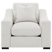 Create your favorite cozy reading nook with this transitional lounge chair, upholstered in a white trillium polyester blend fabric across elegant sloped track armrests and a tailored top-stitched reversible box seat and back cushion. A solid wood frame beneath offers long-lasting stability as bold and contrasting cappuccino finish block style legs peek out from the bottom and offer a slight elevation over decorative rugs and flooring. Key Features: • Soft sloped, wide track arms • Relax in trillium filled cushions that create a down-like seating comfort • Reversible seats and backs • Boxed seat and back cushions with top stitching for a tailored look • Wide solid wood legs in cappuccino complement the arm width