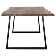 Revel in the light, airy design influence of this wood and metal dining table. Grey sheesham wood finishing ensures a rich, dimensional look perfect to elevate any dining space. A wide rectangular tabletop is perfect for seating six for a scrumptious holiday meal or a leisurely chat over dessert and a nightcap. The base of the table features a pair of metal braces in a black finish that offers lovely contrast. The open nature of the table's base preserves it's open beauty and elegance. Key Features: • Rectangular dining table features grey sheesham wood top with natural live edge detail • Open sled-style metal legs in black finish provide bold industrial contrast • Eighty-inch tabletop comfortably accommodates up to six guests • Solid sheesham wood offers durability with rich wood grain variation • Iron base ensures strength and modern structural support • Ideal for rustic, industrial, or transitional dining spaces seeking organic texture