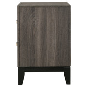 A contemporary take on mid-century modern design, the color blocking from this grey two-drawer nightstand sets it apart from the rest. Constructed of oak, the body showcases a light, exposed wood grain that oozes sophistication. Tapered legs in a black finish offer a modern feel, adding visual intrigue with neutral hues. Bright and metallic, light drawer pulls curve off the flat drawer fronts in a half moon shape. Complete a retro motif, or add fun flair to an up-to-date scheme. Key Features: • Transitional style bedroom at a great value • Nickel finished hardware highlights two-tone grey oak finish • Black grooves create a dimensional look • Three-dimensional engineered foil paper veneer in grey oak and black • English dovetail drawer construction • Black finish legs are crafted of solid hardwood