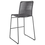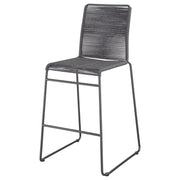 Create visual texture with this contemporary rope woven stool. A tall and slender metal frame in a gunmetal finish, wrapped in charcoal tone rope around the backrest and seat, offer a restful spot for family and guests at elevated dining areas. The metal frame offers an open, airy feel with its slim seat and angled legs, and extra support with a lower footrest. With a sled-style base, this stool slides gracefully up to a bar top or counter height tabletop for drinks, meals and more. Lastly, a dark hue throughout creates a dramatic, natural vibe for modern farmhouse and boho-inspired homes. Key Features: • Create a restful spot with a tall and slender metal frame in a gunmetal finish, wrapped in charcoal tone rope around the backrest and seat • Metal frame offers an open, airy feel with its slim seat and angled legs, plus extra support with a lower footrest • Sled-style base slides gracefully up to a bar top or counter height tabletop for drinks, meals and more • Dark hue throughout creates a dramatic, natural vibe for modern farmhouse and boho-inspired homes • Visual texture with this contemporary rope woven stool