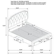 Indulge in comfort and utility with this platform storage bed, where graceful design meets everyday practicality. A tufted velvet headboard with gentle curves and nailhead trim brings refined elegance, while four built-in drawers offer generous hidden storage. Expertly crafted from rubberwood, engineered wood, and foam, this fully slatted frame eliminates the need for a foundation. It's a sophisticated solution for streamlined, serene living. Key Features: • Queen platform bed with scalloped tufted headboard for graceful tailored dimension • Cream velvet upholstery with button tufting and nickel nailhead trim for elegance • Includes four spacious drawers for concealed clothing or linen storage solutions • Fully slatted base supports mattress directly with no foundation or box spring • Built from rubberwood and engineered wood for stability, durability, and strength • Foam-filled headboard adds comfort while combining classic detail with function