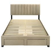Clean lines and quiet storage come together in this upholstered platform bed, where form meets thoughtful function. The vertical channeled headboard adds a tailored touch, while built-in drawers offer seamless storage at the foot and sides. Wrapped in a soft woven fabric and anchored by a weathered mango base, it blends comfort, utility, and calm geometry. Designed for uncluttered rest, it grounds the bedroom with ease and intention. Key Features: • Upholstered queen bed with vertical channel tufting across a clean, tailored headboard • Four drawers integrated into the base for discreet side and footboard storage • Platform design supports mattress directly without the need for a box spring • Ideal for compact sleeping areas where storage and function are essential • Crafted from mahogany, engineered wood, and mango veneer throughout