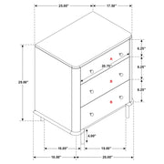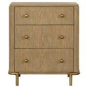 Retro charm meets modern function in this three-drawer nightstand, featuring a warm sand wash finish with subtle wire-brushed texture. Round aged brass knobs and matching tubular metal legs add a hint of glamour, while a built-in dual USB port offers convenient bedside charging. The top felt-lined drawer keeps delicate items safe, blending timeless mid-century aesthetics with everyday practicality for a refined and functional bedroom accent._x005F_x000D_ Key Features: • Three-drawer nightstand with soft sand wash wire-brushed finish • Aged brass knobs and metal legs enhance its mid-century appeal • Top drawer lined with felt to protect delicate items • Built-in dual USB ports for convenient bedside charging • Crafted from rubberwood, engineered wood, and ash veneer • Elegant rounded corners and tubular legs add modern balance