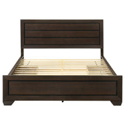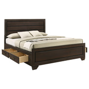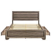 Indulge in a love of basic nature. Fresh, inspiring aesthetics combine to make this bed a great choice for a transitional room. Linear design elements create optically pleasing balance while a washed taupe finish results from a gorgeous patina in greyish-brown. Side storage increases utility. This bed serves beautifully through a series of room redesigns. Key Features: • Storage panel bed with bold rectangular framing and a streamlined silhouette • Washed taupe finish highlights wood grain texture with contrasting black grooves • Includes dual drawers on each side rail for concealed underbed storage • Recessed panel headboard offers visual depth and structured design • No foundation required thanks to supportive slatted base construction • Engineered wood build with durable laminate veneer and framed case detailing