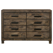 Complete your bedroom with the rugged elegance of this eight-drawer dresser. Crafted with solid hardwood, it features a full matte rustic golden brown finish with wire-brushed details that highlight the natural wood grain. Eight roomy drawers provide ample storage space for clothing, linens, or accessories, each fitted with durable wooden pull handles for a cohesive design. Resting on sturdy block-style legs, this dresser combines rustic charm with everyday practicality, making it a timeless addition to a transitional bedroom setting._x005F_x000D_ Key Features: • Rustic golden brown dresser crafted with solid hardwood for durability • Matte finish with wire-brushed details highlights natural wood grain • Eight spacious drawers offer ample storage for clothing and accessories • Wooden pull handles provide sturdy function and rustic handcrafted charm • Block-style legs deliver strong support and a rugged visual foundation • Perfect for pairing with matching nightstand, chest, and storage bed