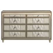 Wrapped in sumptuous ivory and camel velvet, this eight-drawer dresser exudes soft luxury with functional brilliance. Reflective acrylic accents, crystal knobs, and quilted fronts enrich each drawer, while LED trim and a clear tempered glass top add a luminous, polished finish. Solid rubberwood legs elevate the profile, and brown felt-lined top drawers, dovetail joinery, and heavy-duty glides ensure enduring performance and elegance. Key Features: • Eight-drawer dresser fully upholstered in ivory and camel velvet for layered softness • Clear tempered glass top adds protection and polish to the surface • LED lighting outlines the case with soft glow to enhance glam dimension • Crystal knobs, quilted fronts, and acrylic accents for radiant visual texture • Brown felt-lined top drawers protect delicate accessories and essentials • Solid and engineered wood frame with dovetail drawers and solid rubberwood legs