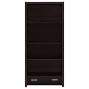 Enhance your office or living space with this modern bookcase, offering both open shelving and concealed storage. The rich cappuccino finish brings a warm and sophisticated touch, while four spacious shelves provide ample room for books, décor, and office essentials. Two adjustable shelves allow for customizable organization, while a lower drawer with sleek silver handles offers discreet storage. Built from durable engineered wood and laminate veneer, this bookcase is a stylish and practical addition to any workspace or home library. Key Features: • Modern bookcase with a sleek cappuccino finish for a refined look • Four spacious shelves, including two adjustable for flexible storage • Lower drawer with smooth Euro glides provides concealed storage • Durable MDF, engineered wood, and laminate veneer construction • Perfect for home offices, living rooms, or study areas • Pairs beautifully with matching office furniture for a cohesive setup