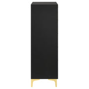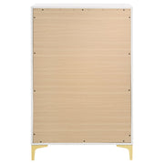 Open up your tight bedroom floor plan with this stately modern glam chest. Five spacious drawers stacked on top of one another keep garments and bedroom essentials stowed away and organized, helping you find what you need fast. A bright, white finish offers a sleek elegance, set off by warm golden accents. Along each of the five drawers is a slender gold finished pull, matched by the golden bracket legs that lift it up. Place this stunning five-drawer chest in your bedroom for an elegantly understated contemporary aesthetic. Key Features: • Perfect for contemporary and modern bedrooms • Five deep drawers offer all the space you need for garments and accessories • The bright, white finished frame ensures a light and airy disposition • Gold finished pull handles create a luxe flair • Gold bracket style legs carry through the warm metallic accents