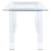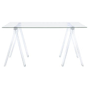 Enjoy an airy workspace with this 59-inch writing desk, pairing a sleek acrylic sawhorse base and a clear tempered glass top. Heavy gauge steel supports, finished in electroplated chrome, connect the legs for added stability and a polished accent. The translucent design keeps your office bright and open, suiting both modern and minimalist décor. Perfect for writing, studying, or creative tasks, this piece merges function and cutting-edge style seamlessly. Key Features: • 59-inch writing desk for a spacious work surface • Clear tempered glass top exudes a chic, minimalist feel • Acrylic sawhorse base brings sleek, modern appeal • Heavy gauge steel supports in electroplated chrome for extra stability • Transparent design keeps your workspace bright and uncluttered • Ideal for home offices, studios, or contemporary setups