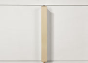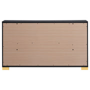 Soak up the sleek and simple yet compelling look of a six-drawer dresser with a dramatic aesthetic that changes the tone of your contemporary bedroom. Modern design details produce a chic vertical dresser with an Art Deco vibe and tons of storage space. Made of wood products, this six-drawer dresser features a versatile finish with glam accenting from gold finish metal, placed carefully to emphasize a geometric linear effect. Store incidentals and accessories in drawers operating smoothly on center metal glides. English dovetail drawer construction embellishes this dresser’s quality, as vertical gold metal drawer hardware offers a unique impact. Key Features: • Sleek and simple six-drawer dresser with dramatic aesthetic to change tone of contemporary bedroom • Modern design details with chic Art Deco vibe and tons of storage space • Made of wood products with versatile finish and gold finish metal accenting for geometric linear effect • Drawers operating smoothly on center metal glides with English dovetail drawer construction • Vertical gold metal drawer hardware for unique impact