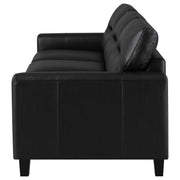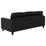 A bold foundation for the living room, this sofa blends sculpted geometry with softened strength. Wide track arms embrace deep seating wrapped in smooth upholstery, offering a serene escape from the everyday. Refined stitching adds subtle dimension across its tailored form. Designed for comfort, presence, and timeless appeal, this sofa transforms modern lounging into a grounded, intentional experience. Key Features: • Sofa with wide track arms and deep seat for modern lounge comfort • Black leatherette finish adds sleek texture with a refined matte surface • Structured cushions provide firm support with subtle stitched definition • Block legs match upholstery for a cohesive monochrome presentation • Built from pine, plywood, foam, and polyurethane leatherette materials • Ideal for anchoring modern living spaces with bold yet practical design