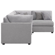 This modular sectional sofa embodies contemporary comfort with clean lines, inviting textures, and customizable flexibility. Upholstered in soft grey fabric, it features supportive cushions wrapped in plush feather-down for an indulgent seating experience. Subtle wedge details and tapered block feet lend modern refinement, while the modular design allows each piece to adapt effortlessly to any space. Perfect for family gatherings or relaxed lounging, it delivers style, durability, and lasting comfort in one cohesive design._x005F_x000D_ Key Features: • Modular sectional sofa with soft grey upholstery offers modern style and plush comfort • Configurable design allows flexible seating layouts for any living room arrangement • Hidden storage ottoman adds versatility for blankets, pillows, or everyday essentials • Plush feather-down wrapped cushions deliver inviting comfort and long-lasting support • Tapered block feet and subtle wedge details enhance its contemporary refined profile • Perfect for relaxing, entertaining, or family gatherings in a cozy modern setting