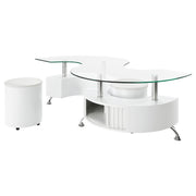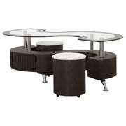 This coffee table features a serpentine shape with a clear tempered glass top and a durable engineered wood base. It includes two stools with padded seats, upholstered in faux leather for added comfort. A sliding door on both sides provides convenient storage space, while chrome accents enhance its sleek, modern design. This piece combines practicality with contemporary style, making it an ideal centerpiece for any living room. Key Features: • Curved serpentine coffee table with clear tempered glass top and chrome accents • Engineered wood construction for lasting durability and sturdy design • Two stools with faux leather upholstery and padded seats for added comfort • Sliding door opens to reveal convenient storage on both sides of the table • Chrome accents contribute to the sleek and modern aesthetic • Cappuccino wood-look finish provides a rich, sophisticated appeal