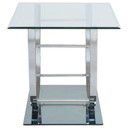 This modern square end table combines a clear tempered glass top with a sleek mirrored base, creating a visually striking design. The curved electroplated heavy gauge metal frame in a polished chrome finish adds elegance and stability. Crafted for durability and style, this versatile accent table is ideal for contemporary living spaces, offering functionality and refined aesthetics in equal measure. Key Features: • Modern square end table with a clear tempered glass top • Reflective tempered mirrored base adds visual appeal • Sturdy electroplated metal frame in polished chrome finish • Sleek curved design creates a stylish, modern look • High-quality materials ensure durability and long-term use • Perfect for adding function and style to any living space