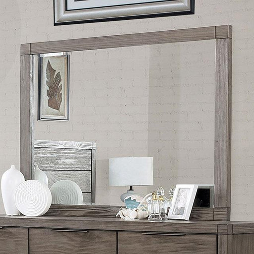 A warm, wire-brushed finish and plank-style aesthetics give this mirror and the Amarillo set a cohesive look.