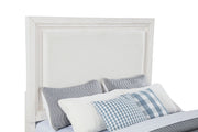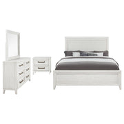 Embrace the fresh, contemporary style of a four-piece bedroom set. A distressed white finish highlights wood grain texture, while clean lines define the set with refined, inviting ambiance. The bed pairs a tall headboard and low footboard for an open profile adding to the modern appeal of this set. It includes a six-drawer dresser with a framed mirror, creating ample storage for clothing and linens. A two-drawer nightstand adds bedside storage and provides the perfect spot for a reading lamp or a vase of fresh flowers. Key Features: • A four-piece modern bedroom set offers a clean-lined silhouettes • Distressed white finish highlights wood grain details and bar hardware to create texture and depth • Six-drawer dresser and two-drawer nightstand offer plentiful storage and organization • The bed features a low footboard for an airy open look and requires a foundation