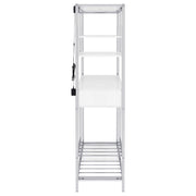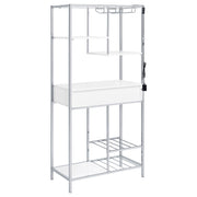 A modular design with integrated LED lighting offers a fresh, modern look, perfect for hosting guests in your contemporary setting. This wine cabinet features a minimalist and linear design with four open shelves, a convenient pull-out drawer, two tiers of wine bottle storage, and integrated stemware racks. Constructed from engineered wood in a white high-gloss, scratch-resistant finish, it is complemented by a sleek silver-finished rectangular frame. Combining style and functionality, it’s an ideal choice for serving and entertaining. Key Features: • Modular wine cabinet with LED lighting and four open shelves • Engineered wood in a white high-gloss, scratch-resistant finish • Sleek chrome finished rectangular frame for a modern aesthetic_x005F_x000D_ • Single pull-out drawer for added storage convenience • Two tiers of wine bottle storage for efficient organization • Integrated stemware racks keep glassware easily accessible