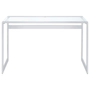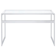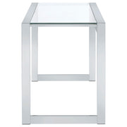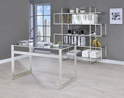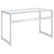 Achieve a sleek and modern workspace with this glass writing desk, perfect for home or commercial office settings. The spacious clear tempered glass top offers a minimalist aesthetic while providing ample room for work, design, or brainstorming sessions. Supported by a sturdy chrome metal frame, this desk ensures stability and durability while enhancing contemporary interiors. Whether used for professional tasks or creative projects, this stylish desk brings both form and function to any workspace. Key Features: • Modern writing desk with a sleek chrome-finished frame • Clear tempered glass tabletop creates a spacious, airy look • Durable metal and glass construction ensures long-lasting stability • Minimalist design complements contemporary, home, or commercial offices • Generous workspace ideal for writing, designing, or working on a laptop • Perfect addition to modern workspaces, studios, or study areas