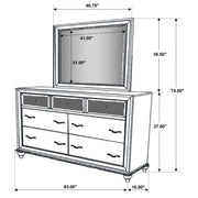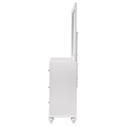 Elevate your bedroom with the glamorous appeal of this dresser and mirror set. The seven-drawer dresser showcases sparkling acrylic panels on its top drawers, complemented by faceted crystal hardware for radiant elegance. A crisp white finish highlights its clean silhouette, while turned bun feet add a timeless touch. The coordinating mirror features a beveled wooden frame that reflects light beautifully, enhancing the dresser’s bold style. Built with solid rubberwood, engineered wood, and okume veneer, this set balances chic design with lasting durability._x000D_ Key Features: • Seven-drawer dresser with sparkling acrylic panels and crystal hardware • White finish enhances the clean silhouette and brightens bedroom spaces • Turned bun feet add a classic design detail to the glamorous presentation • Rectangular mirror includes a beveled wooden frame for elegant dimension • Frame built with solid rubberwood, engineered wood, and okume veneer accents • Two-piece set combines storage and reflection for a cohesive bedroom design