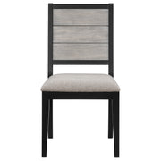 Complete your dining set with these stylish chairs featuring a sleek grey and black two-tone finish. Designed with a sturdy plywood base, they offer durability and stability. The cozy dove grey fabric, crafted from 100% polyester, provides a comfortable seating experience. Elevate your dining area with these chic and cozy side chairs that combine style and functionality seamlessly. Key Features: • Stylish two-tone grey and black finish • Sturdy plywood base for durability and stability • Cozy dove grey fabric crafted from 100% polyester • Comfortable seating experience • Combines style and functionality seamlessly
