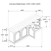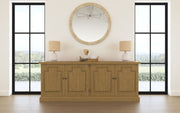 This four-door sideboard offers a refined blend of storage and style, perfect for dining and entertaining spaces. Crafted from pine, plywood, and pine veneer, it features a beautifully planked top that enhances its rustic charm. Raised panel doors lend a classic, sophisticated appeal, while the spacious interior includes two nested drawers with self-closing metal slides for effortless organization. This versatile piece functions beautifully as a server, providing ample space for dishware and linens. With its elegant craftsmanship, it also serves as a buffet, adding both convenience and timeless appeal to any home. Key Features: • Four-door sideboard with raised panel doors for a classic, textured look • Pine, plywood, and pine veneer construction ensures lasting durability • Planked top highlights the natural grain with a rustic honey finish • Spacious interior storage includes two nested drawers for organization • Self-closing metal slides ensure smooth and effortless drawer operation • Warm rustic honey tone enhances farmhouse and traditional decor