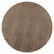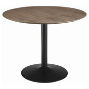 Create a cozy dining spot with this retro-modern round table, featuring a rich walnut veneer top and a smooth black pedestal base. The compact 40-inch size makes it ideal for breakfast nooks or smaller dining areas, while the clean silhouette and warm wood tone offer a touch of mid-century charm. Its sturdy base and inviting finish make it a stylish staple for casual or contemporary interiors. Key Features: • Round dining table with smooth walnut veneer top in a rich brown finish • Black pedestal base offers a clean, contemporary silhouette and stable support • Retro-inspired design adds character to modern or transitional dining spaces • Compact 40" size comfortably seats two to four guests • Durable engineered wood tabletop combines beauty with everyday function • A stylish choice for eat-in kitchens, studio apartments, or breakfast nooks