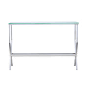 Add modern sophistication to your home with this sleek rectangular console table. Featuring a clear tempered glass top and a matching lower shelf, it offers ample space for storage or display. The elegant curved legs and open design enhance its airy, contemporary feel, while the electroplated polished chrome frame ensures durability and style. Perfect for hallways, entryways, or behind a sofa, this console table blends functionality with a striking modern aesthetic. Key Features: • Rectangular console table with a clear tempered glass top • Matching tempered glass shelf provides storage or display space • Curved, modern legs create an open and stylish aesthetic • Electroplated polished chrome base ensures strength and shine • Smooth tempered glass surfaces are easy to clean and maintain • Versatile design fits perfectly in hallways, entryways, or behind sofas