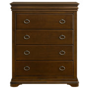 This four-drawer chest brings refined storage to traditional bedrooms with clean molding, antique nickel hardware, and a rich cherry finish. Felt-lined top drawers offer delicate protection, while cedar-lined bottom drawers help resist moisture and odor to preserve garments. With smooth gliding drawers and a stately silhouette, this chest delivers both classic appeal and long-lasting utility. Key Features: • Four-drawer chest with crown molding and stately silhouette for bedroom storage • Brown cherry finish pairs with antique nickel ring pulls for elegant contrast • Top drawer is felt-lined with tinted interior and English dovetail joinery • Cedar-lined bottom drawers protect clothing by repelling odor and moisture • Drawers glide on 45mm metal runners for smooth and reliable functionality • Constructed from solid rubberwood, engineered wood, cherry veneer, and plywood