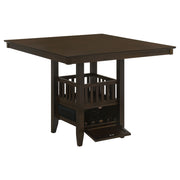 This counter height dining table brings refined style and smart functionality to any dining area. Its square silhouette and rich espresso finish create a sophisticated look that blends beautifully with transitional décor. A slatted pedestal base adds visual interest while offering built-in storage, including a wine glass rack and concealed compartment for bottles or accessories. Crafted from rubberwood, engineered wood, and okume veneer, this table combines timeless elegance with everyday practicality. Key Features: • Counter height table in espresso finish enhances dining spaces with warm sophistication • Square top design offers generous dining surface ideal for family meals or gatherings • Slatted pedestal base adds architectural interest with transitional appeal • Built-in wine glass rack and concealed compartment provide convenient storage • Crafted from rubberwood, engineered wood, and okume veneer for lasting durability • Perfect centerpiece for compact dining rooms or contemporary kitchen settings