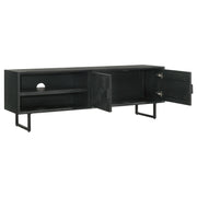 A dramatic charcoal black finish coats wood products construction, adding a bold look to this casual yet elegant TV stand. Gather entertainment-related gear and organize it in this tasteful stand built of mango wood with a rustic aesthetic. Set atop black finish iron bracket legs, it creates a sturdy venue for a large flat-screen TV. Components find room in two side compartments, as incidentals and media may be stashed on a fixed shelf behind two side doors with ornate iron hardware. Avoid clutter with a pre-cut wire management hole. Key Features: • Elevate your entertainment area with a TV stand featuring a dramatic charcoal black finish, infusing a bold and elegant touch • Crafted from wood products with a mango wood rustic aesthetic, this stand offers a tasteful solution for organizing your entertainment-related gear • Sturdy iron bracket legs in a matching black finish provide a stable base for your large flat-screen TV • Keep your components organized in two side compartments, while incidentals and media items can be stored behind two side doors adorned with ornate iron hardware • Say goodbye to cable clutter with a convenient pre-cut wire management hole, maintaining a clean and tidy look in your living space