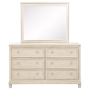 Breezy and balanced, this dresser and mirror set captures the warmth of coastal mornings and the elegance of timeless design. Framed with stepped trim and polished nickel ring pulls, the six-drawer dresser offers generous storage wrapped in washed oak serenity. Above, the mirror reflects light and openness, framed to echo the dresser’s graceful form. Crafted from poplar, oak veneer, and engineered wood, this set brings gentle refinement to the heart of the bedroom. Key Features: • Six-drawer dresser and mirror set with stepped trim and clean, symmetrical lines • Washed oak finish highlights wood grain with soft, sun-bleached character • Polished nickel ring pulls offer traditional elegance with subtle shimmer • Spacious drawers store clothing and essentials with everyday ease • Mirror reflects light and adds openness to any bedroom setting • Crafted from poplar, engineered wood, oak veneer, and mirrored glass for durability